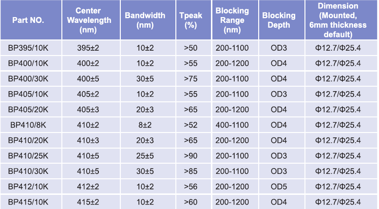 帶通濾光片波長范圍:395nm-415nm