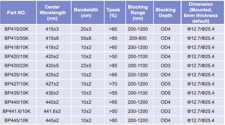 帶通濾光片波長范圍:415nm-445nm