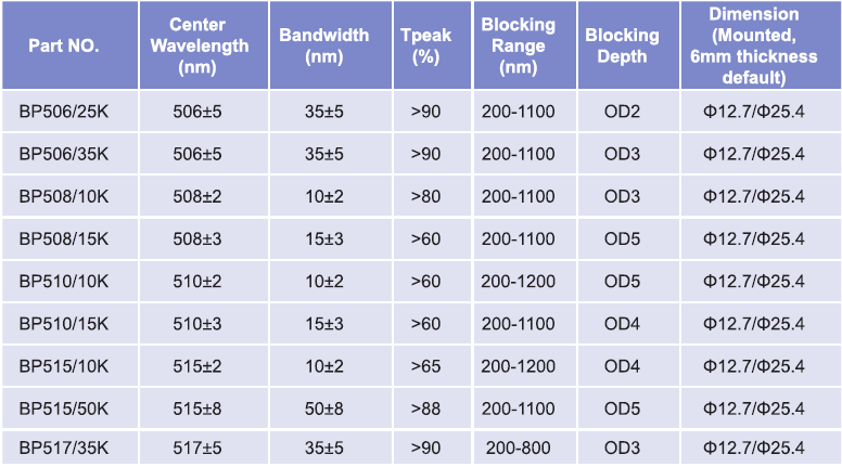帶通濾光片波長(zhǎng)范圍:506nm-517nm
