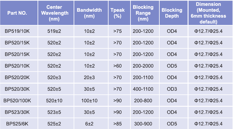 帶通濾光片波長(zhǎng)范圍:519nm-525nm