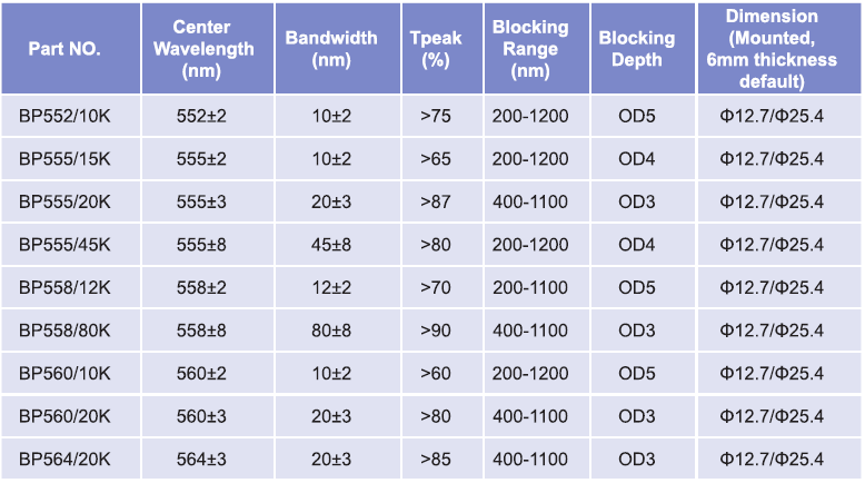 帶通濾光片波長(zhǎng)范圍:552nm-564nm