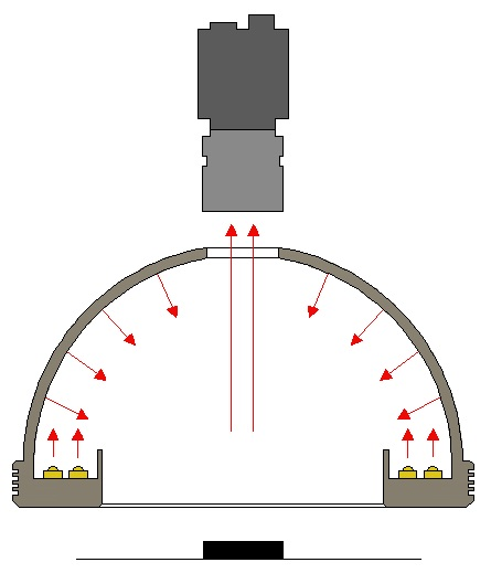 光源從底部發光,經過多次漫反射形成無影光源,DOME光源是一種高均勻性的光源,適用于表面凹凸不平、反光物體檢測。