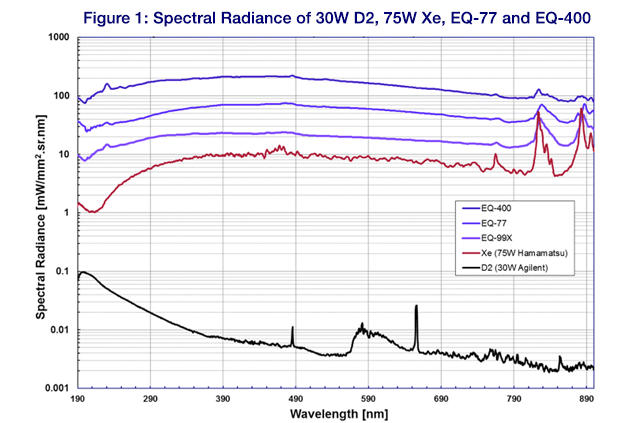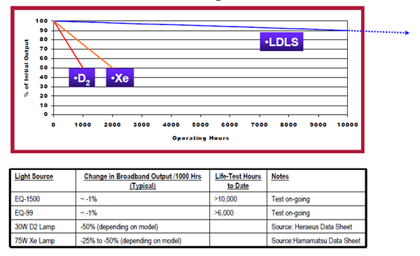 • The spectral radiance (brightness) of the LDLS exceeds that of traditional Xe and Deuterium sources